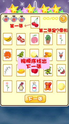 1、选择界面挑战或者训练来进入游戏2、玩法很简单,玩家你需要根据游戏展示的顺序来记忆各种水果图片;
