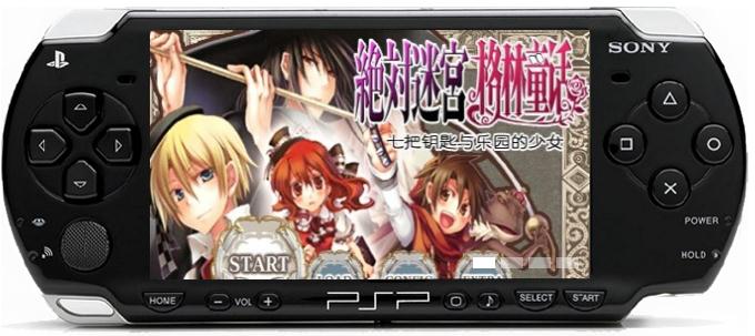 PSP版《绝对迷宫格林童话:七把钥匙与乐园的少女》(Zettai Meikyuu Grimm: Nanatsu no Kagi to Rakuen no Otome)以大家所熟知的《格林童话》故事为背景,改编成的一款女性向恋爱冒险游戏。其世界观比较独特,有点类似于《王国之心》(Kingdom Hearts)的童话世界。