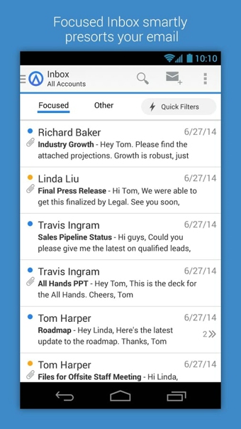 智能筛选可按已读、未读、标记等更多选项分类邮件,一键完成。只需输入几个字母,Acompli智能预测搜索可快速找到邮件、联系人和文件。