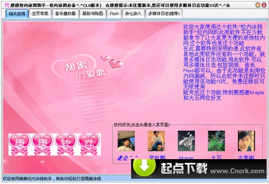 使用该工具,可以更快捷的完成复杂的涂鸦板操作,使用唐唐校内网助手不光可以快速生成各种代码,更重要的是,可以写“多媒体日志!!!”,这样,大家在写日志时不再仅仅写文字了,还可以贴视频,加音乐,加Flash,加MV:)