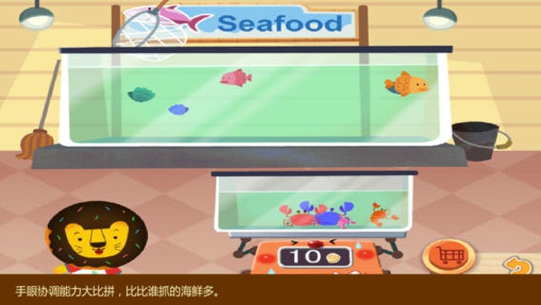 *海鲜区:手眼协调能力大考验,先抓到鱼和海鲜,才能称重哦。