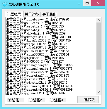软件一共提供了三个获取迅雷VIP账号途径,分别是:途径1获取地址:http://xlfans.com/archives/category/迅雷分享