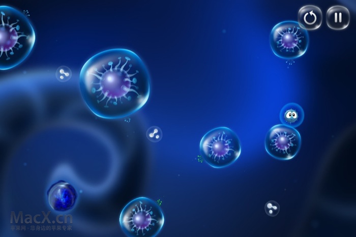 游戏的细节制作的很完美,当你拖拽Cyto时,他的眼睛还会跟随着你的手指各种仰望,看着活灵活现。游戏中细胞泡泡的风格看上去很清新,蓝色的基调也很舒服。画面制作的虽然没有3D那么宏大、壮美,不过各种细致还是别有一番风味的。