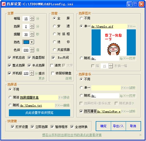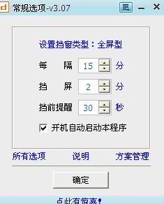 挡屏提醒休息具有间隔时间、挡屏时间、挡屏前提醒时间及图片可自行设置,配置文件可导入、导出等特色,软件未屏蔽任何系统功能键,适合不同场合提醒休息之用。