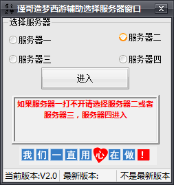1、下载辅助并解压,双击运行“瑾哥造梦西辅助第三代V2.0.exe”2、出现服务器选择窗口,如果服务器一打不开,请选择服务器二,以此类推