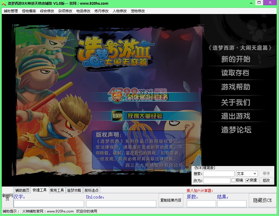怪物暴击【小怪,天庭,玲珑宝塔,水下迷宫,都率宫,回到过去,流沙河,隐藏副本,载教天镜,等等】综合修改【隐藏存档,无限副本,二十八星宿,八卦眩晕,无限使用,无限领取,无限药园,逆天修改,攻击秒杀(进入副本修改),变态回血(进入副本修改),全屏技能(进入副本修改),无限闪避(进入副本修改,加速模式(进入副本修改),飞行模式(进入副本修改),法宝无冷(进入副本修改),无限无双(进入副本修改)】
