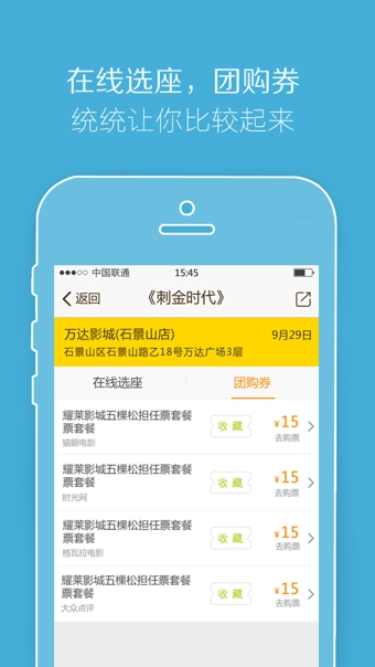 3、团购票:接入美团,糯米,窝窝团,大众点评等多家电影票服务商