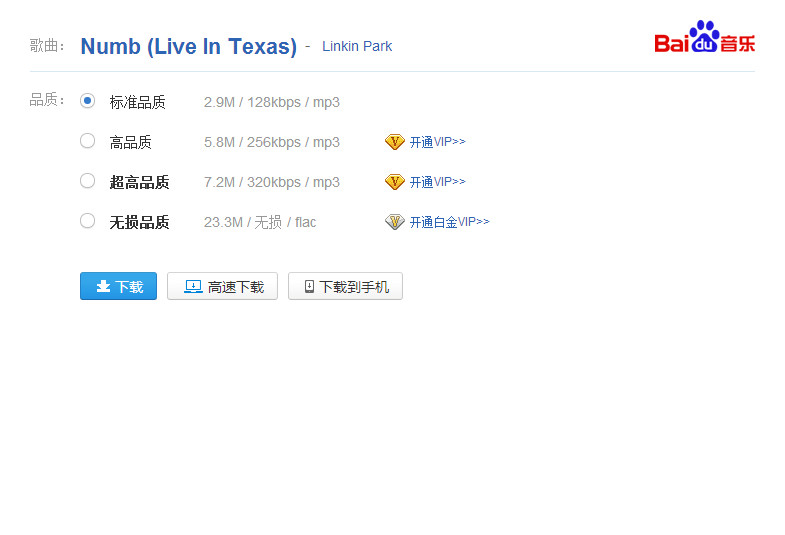 8、点击下载歌曲的时候,百度音乐助手就直接讲所有歌曲品质的下载展示出来。用户可以直接点击高品质无损音乐,无需会员帐号。