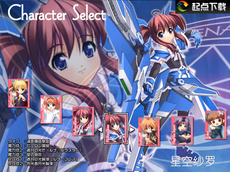 奈叶 『魔法少女奈叶A's』(高町奈叶.远距离炮击型.是最初的角色,被作为开发其他全部人物的基准)菲特 『魔法少女奈叶A's』(Fate.中距离万能型,所有角色中唯一可以切换中/近战模式角色)