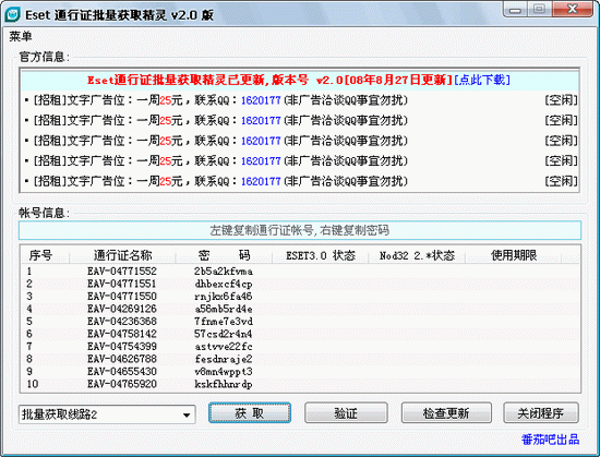 Eset 通行证批量获取精灵 V2.5 简体中文绿色免费版 欢迎您使用本软件,使用前请杀毒。最好是到作者官方站下载, 这样可能会更安全些,以免遇到不法份子捆绑了恶意程序对您的机器 造成破坏