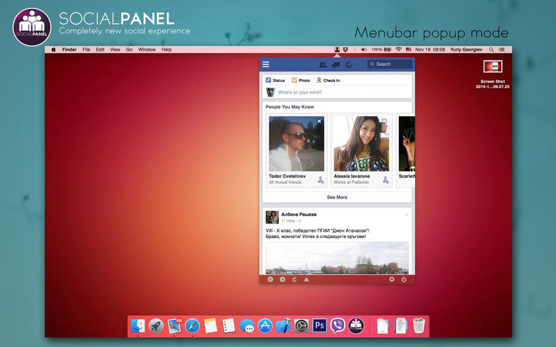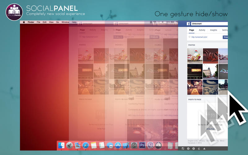 1、socialpanel保持隐藏,从你的桌面不打扰您的工作和褪色或当你把鼠标移动到屏幕的右侧(不包括的角落,所以你可以使用OS X的热角的快捷方式)。2、当显示,socialpanel放置在所有的窗口(包括菜单栏),你可以在你的社交活动有完整的焦点。