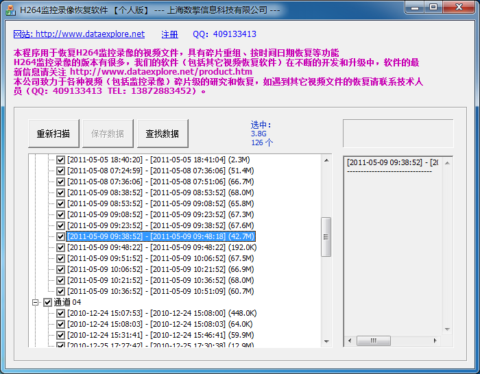H264监控录像恢复软件(带碎片重组功能)是专门用来恢复常见的嵌入式监控录像机(这种监控录像机中硬盘的底层数据中有“H264”标志)中的监控视频文件;是碎片级的录像监控恢复软件,能自动分析出时间并重组各个通道的视频;可以按时间点查询列出所需的文件,大大减少挑选某个时间段的监控镜头的时间。