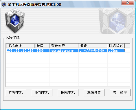 多主机远程桌面连接管理器1.00是一款绿色软件,无广告,无插件,免费软件。该软件支持多远程主机的管理和连接,采用Windows 的远程连接界面,容易上手,安全性强