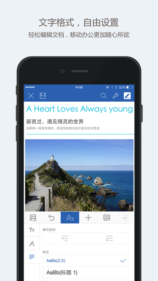 WPS Office iOS版文字模块现具备更多编辑功能,从字体到段落,灵活编辑。文字模块提供了相当丰富的自定义字体选择,你可以根据文档内容或者自己的喜好选择合适的字体,调节字体大小,改变字形,为字体配色。你还可以自由调整段落样式。让选择文字对齐方式,插入并选择项目符号,调整段落缩进方法,规整行距,都变得十分容易。