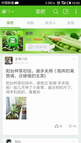 对于大多数都市人而言,种菜还真是个技术活,没有相关的经验,很多时候尽管倾注了爱,但却没有收获菜,怎么办呢?菜吧,专业的阳台种菜技术交流平台就是为了给大家提供一个技术支持和菜友交流的互动平台,广大新菜友可以在这里的:“学习园地”中学到如何选种、播种、施肥、防虫等等技术经验,还可以关注微信公众号:dsytzc,关注微博:都市阳台种菜等。广大老菜友可以在这里展示自己的劳动成果,分享自己的劳动经历,书写自己的种菜日记。有问题积极的在菜吧:“用户交流中心”与大家交流,通过广大菜友的热心帮助,你的阳台种菜生活会越来越美好!你的收获会越来越多。有了菜吧,阳台种菜不彷徨,只要播种了爱,就能收获到菜!