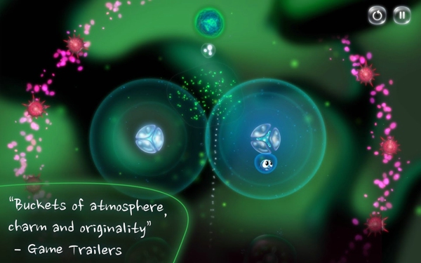 《细胞的益智冒险 Cyto's Puzzle Adventure》是一款优美梦幻的物理益智游戏,由独立游戏工作室 Room 8 制作,游戏画面色彩鲜明,五个世界中都有其代表颜色。造型设计上主角是个蓝色的,有脸的细胞,模样很可爱的说。在关卡中也有许多不同造型细胞,有触手型的、几个细胞一起连接的、飘动的等等,但看起来并不会觉得反感。由于是在五个奇妙的世界冒险,所以背景音乐设计很低沉、阴森,总让人感到随时会有什么意外发生一样。操作上有些相似于《愤怒的小鸟》,点击Cyto往后拉,选择好方向与力度后放手让Cyto弹射出去。Cyto只能够黏在大型细胞的触须上,如果没有触须就会掉落死亡。操作差不多,但玩法就丰富很多了,比如,利用2个细胞中的触须,让Cyto把它们连接到一起,让Cyto迅速的发射出去。点击某个大型的细胞,可以使它的触须收缩,让Cyto掉落到另一个细胞上。绿色的触须,可以让Cyto移动,但却不能弹射。