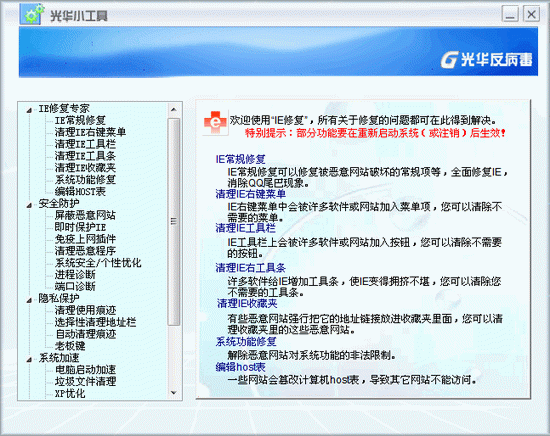 光华小工具是一款绿色综合性系统维护工具,由北京日月光华软件公司研制开发。 光华小工具集IE修复专家、网络安全防护、隐私保护、系统加速和广告拦截5大功能于一体,无须验证注册,无须安装,体积小(210k),轻点鼠标,即可尽享诸多超强功能,不会对系统造成任何污染