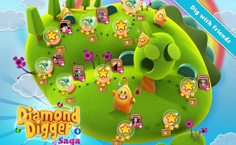 Diamond Digger Saga《钻石矿工传奇》基本上是一个宝石版的《糖果粉碎传奇》。游戏中,主角是一个戴着探照灯的可爱矿工,名字叫Diggy。Diggy负责挖Diamond Dale、Turquoise Meringue和其他的宝石。