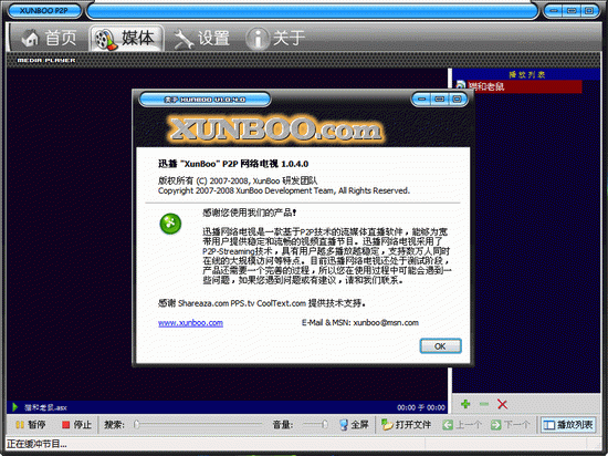 迅播P2P网络电视是一款用于互联网上大规模视频直播的网络电视软件,使用他可以在互联网上免费播出音频、视频节目,也可以通过互联网观看节目。迅播XunBoo采用P2P(Peer-to-Peer)技术传输数据,并且内核采用最新聚合算法非常高效。使用他的技术每个人都可以以很低的成本广播自己的节目,并能够实现用户越多播放越流畅的特性,使得整体服务质量。视频广播不再需要一台超级服务器和大量带宽,个人也可以建设和大型商业网站相媲美的网络直播系统