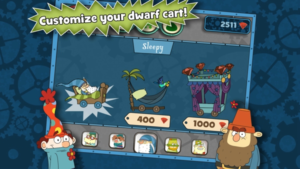 游戏的最大看点就是这 7 个造型不同极富个性的小矮人了,他们也都很符合动画原作的形象,万事通Doc、害羞鬼Bashful、瞌睡虫Sleepy、喷嚏精Sneezy、开心果Happy、糊涂蛋Dopey、爱生气Grumpy,你看我居然还记得他们的名字,简直真爱有木有。更可爱的是通过他们乘坐的矿车,你可以更明显地看出矮人们的性格,比如喷嚏精的纸巾车、万事通的工具车、瞌睡虫的直接就是一张床了,相当搞笑。