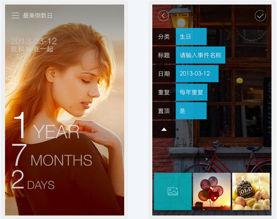 最美时光iPhone版这是一款感性的应用,至少小编是这么认为的。最美时光App其主要作用就是为大家记录那些重要的数据和重要的日期,你可以通过最美时光App记录你和Ta在一起的日子,记录下假期的到来时间,记录宝宝诞生的每一天,你会发现不知不觉这个记录下很多你所认为重要的事情,你会发现原来我们在这个时间上已经生活了成千上万天,你会发现原来那些逝去的时光就这么溜走了,最终你会发现还没长大,却已成年,你会发现还没享受却已老去。希望能够用最美时光APP来唤醒大家正在忙碌的新,希望大家珍惜每一天,对我们来说每一天都是最美。直觉式表达,重要的日子临近程度一目了然。只需简单几步,重要日子尽在掌握。