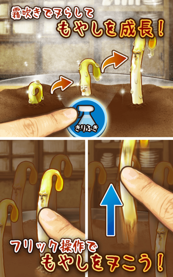 《もやしびと -完全无料!放置型もやし育成ゲーム- 豆芽人》是一款放置类养成游戏,游戏点开会看到培养皿,玩家需要做的就是把水喷到土上,让豆芽菜可以恣意生长,水不够多就会变成乾瘪的豆芽菜,要小心注意。而豆芽菜也会再升级,变成飞机头豆芽菜、酒醉豆芽菜(这怎麽吃阿!)等等,每次去收成都会有惊喜唷!除了可以升级之外,金钱累计足够之後也可以换一下背景,换到理科教室就是有一种新鲜感是不是?不过小编还是想吐槽,豆芽菜不是在黑暗中长比较好吗?不管啦,大家一起来种豆芽菜吧!