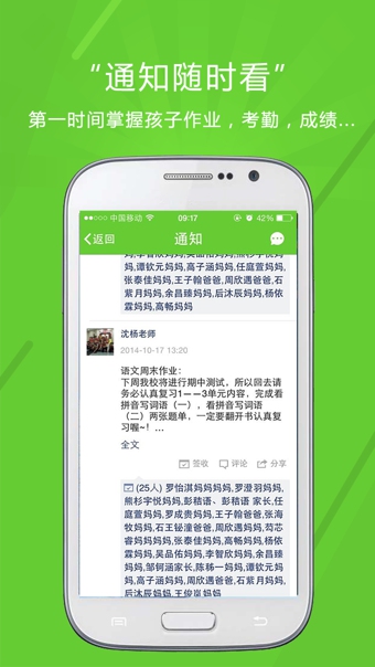 通知功能 - 及时收到学校、班级和老师的各类信息、作业、通知、评语、考勤,考试成绩;