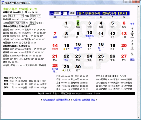 寿星万年历是一款采用现代天文算法制作的农历历算程序,含有公历与回历信息,可以很方便的进行公、农、回三历之间的转换。提供公元-4712年到公元9999年的日期查询功能。其中1500年到1940农历数据已经与陈垣的《二十史朔闰表》核对;含有从公420元(南北朝/宋武帝元年)到今的基本年号。在过去几百年中,寿星万年历的误差是非常小的,节气时刻计算及日月合朔时刻的平均误差小于1秒,太阳坐标的最大可能误差为0.2角秒,月亮坐标的最大可能误差为3角秒,平均误差为误差的1/6。万年历中含有几百个国内城市的经纬度,并且用户可根据自已的需要扩展经纬度数据