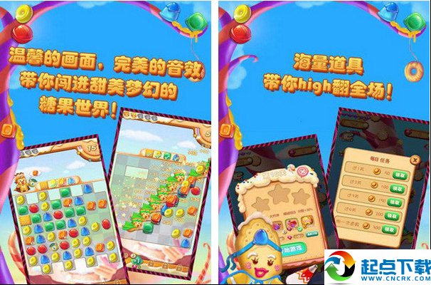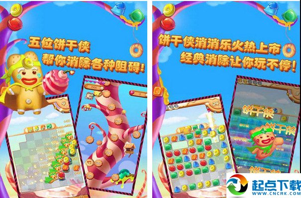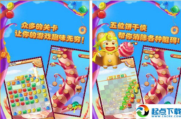 玩家将在梦幻的糖果世界里与5位饼干侠相遇,通过不停地连接相同种类的糖果,从而获得饼干侠赠送的各种种类的道具。随着游戏的推进,玩家将在游戏中遇到各种的阻碍,并在饼干侠道具的帮助下收获糖果。