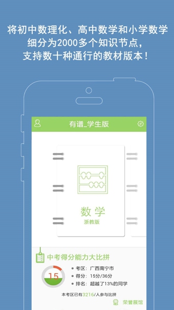 有谱把学科知识细分为三级知识节点(知识节点数是教材中章数量的16倍,节数量的8倍),通过高效的自适应测试机制和大数据的充分应用,配合高品质的测试题(其中80%以上为历年全国中高考真题),孩子在每个知识节点的掌握状态可以精准的定位为“优(三星)、良(二星)、中(一星)、差(无星)、未知”五种状态。并且,孩子在其它学习者中排名情况也一目了然。既可与全国的学习者排名,也可只在本中考考区内排名。 并且,孩子无需花太多时间,每天每科花5-10分钟即可,利用日积月累的碎片时间,我们就可以为学习者呈现完整的认知状态图谱。