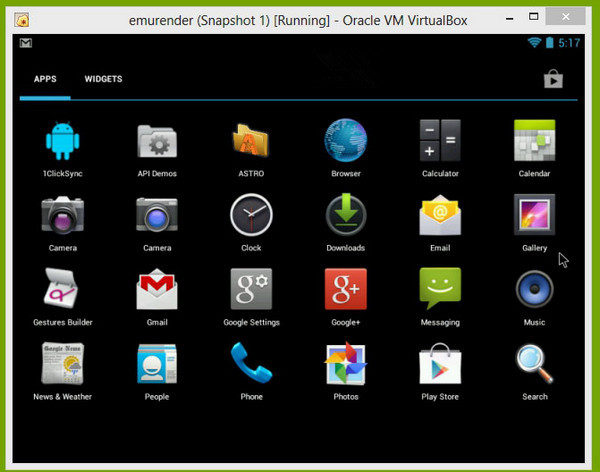 第四步:现在你就应该会看到一个标准的Android主屏幕界面了。可以用鼠标或是触摸屏进行滑动切换操作,另外还有一个全屏按键,点击后电脑就会变成一款Android设备(可惜的是Windows 任务栏依然会显示)。下面,不管是使用谷歌商店下载应用、玩游戏,都可以实现了。