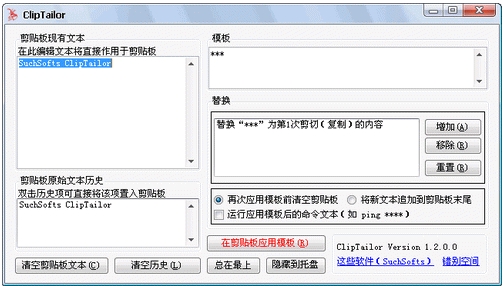 SuchSofts ClipTailor V1.2 简体中文绿色免费版 SuchSofts ClipTailor今晚升级至1.2版,新增“运行应用模板后的命令文本”选项。在ClipTailor的协助下操作剪贴板,可将一次或多次剪切(复制)的文本嵌入到预先设置的模板文本中并整体粘出,甚至可以直接运行应用模板后的命令文本(如“ping ***”),大大提高工作效率。