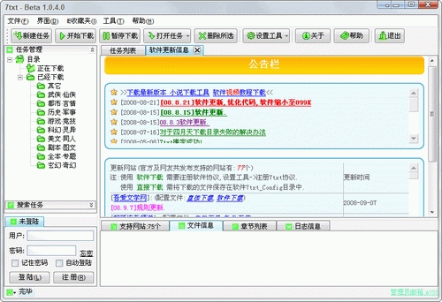 TXT小说下载工具,是由7txt历时三年更新完成的一套完全免费,多功能的下载网络资源工具(暂时主要针对小说TXT),其支持的各类(小说,资源)网站灵活多变,可下载率高达99%以上,软件更新频率超越任何同类产品。