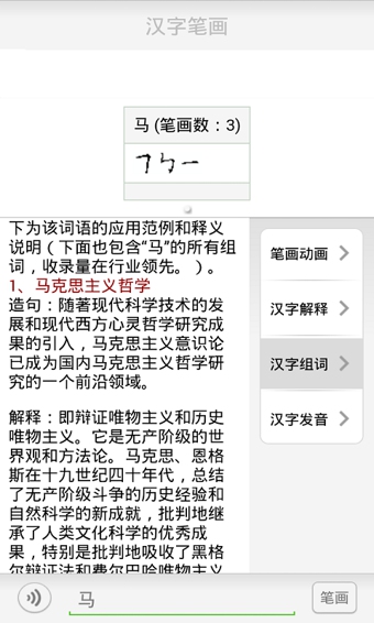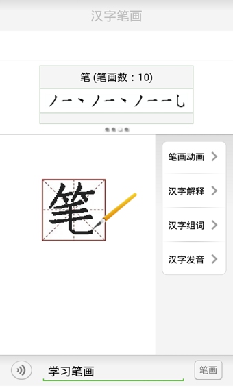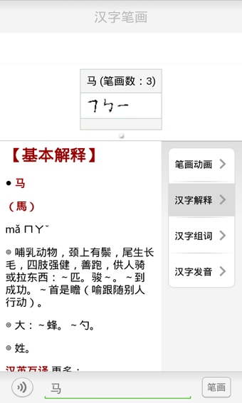 由于信息技术的发展,人们已经习惯于在电脑、平板电脑及手机上打字,而大部分人已经忘记汉字最基本的书写笔画及顺序,本款软件可以轻松搜索汉字的书写笔画和笔顺,通过对每个汉字每个笔画的拆解分析,使用户了解笔画顺序,在此软件中还增加动画书写笔画功能,更加生动形象的描绘每个汉字的笔画、笔顺和精髓。该软件的主要目的是帮助刚刚起步学汉字的小学生和老外了解每个汉字的书写顺序,为学习汉字打下扎实的书写基础。【更新日志】