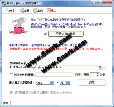 暴风QQ聊天记录跟踪器 V3.3 简体中文绿色免费版 1.每次聊天的信息,都会被实时纪录下来,包括对方发给你的信息。然后在你指定的目录下,保存起来。这样,即使聊天记录在QQ里被删除也无妨,因为记录已经被事先保存起来。
