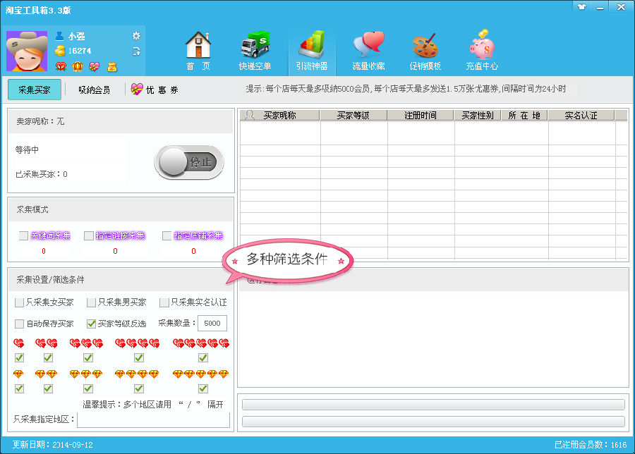 8、采集买家时建议不要设置太多条件,输入关键词时不要太针对性,比如一个买过手机的买家,他也可能再买衣服或鞋子,那一个买过冰箱的买家也可以买衣服或鞋子.