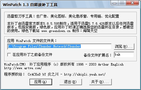 本补丁由迅雷官方版本5.8.5.595制作,适用于迅雷5.7.6.426版本以后任何迅雷版本,包括安装版,绿色版,一步到位的进行去广告、美化图标、美化悬浮窗、专用链、优化配置,并升级为迅雷官方的最新版本