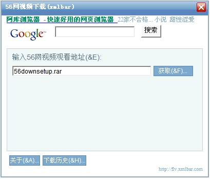 56网视频下载(xmlbar) V3.3 简体中文绿色免费版 56网视频下载(xmlbar)是一个专门用于下载56网视频到本机硬盘上的小软件。它不但完全免费而且干净不含有任何插件,可以完全干净卸载。用户只需输入需要下载的56网视频的观看页面地址并按下下载按钮,它就会自动识别后进行下载,下载的文件格式为flv。更好的是它还支持多个56网视频文件同时下载,并能显示出真实的56网视频文件的下载地址,下载完后您还可以选择马上播放,而且还有查看管理下载历史记录的功能