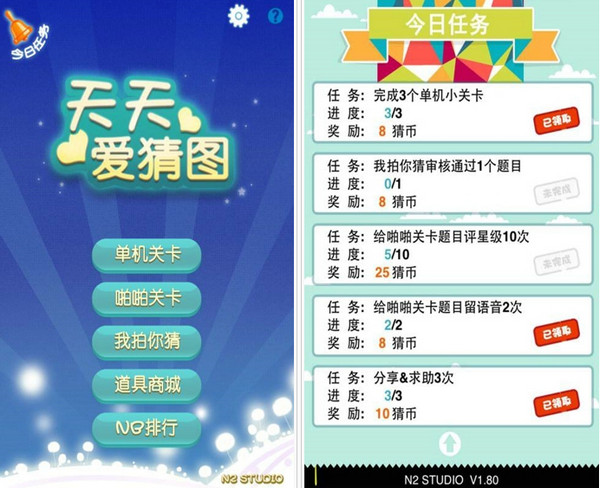 天天爱猜图是2013最牛最疯狂的猜图游戏!风靡大江南北、老少皆宜、男女通吃的猜图游戏可以微信和QQ分享、比拼啦!快快请你的微信好友、QQ伙伴一起来“天天爱猜图”,和小伙伴们比比谁的IQ更高!【电脑版的特色】