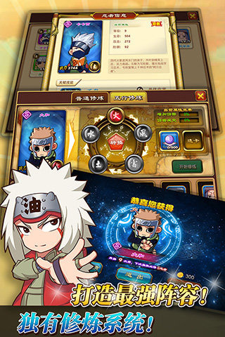疾风忍者下载游戏中有完美的伙伴培养系统,玩家可以通过收集各种各样的卡牌,并且升级它们的装备,将它们培养成最强的组合,重现火影世界。
