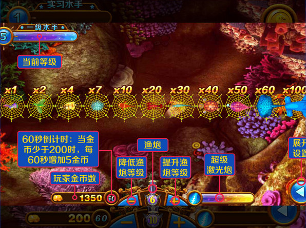 3、点击界面下方左右大炮即可升级切换操作。疯狂的50倍大炮,让你体验无尽的快感;