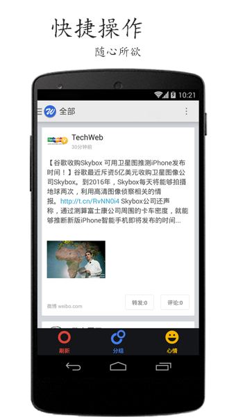 Welike新浪微博客户端顺滑版重磅来袭!超乎想象的流畅度让你爱不释手!和官方客户端完全不一样的体验,界面更简洁、清新,打开图片更迅速,操控更加随心所欲。专为Android用户提供贴心、流畅的微博体验,让你第一时间了解朋友动态,并分享自己的生活点滴!快点来体验吧。We all like it!