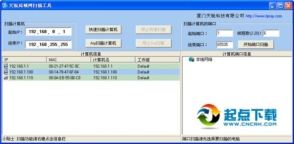 天锐局域网扫描工具是一款局域网在线计算机扫描和端口扫描软件,采用多线程技术。扫描局域网内在线计算机的主机名称,IP地址,网卡MAC地址,所在工作组以及各个电脑开放的端口