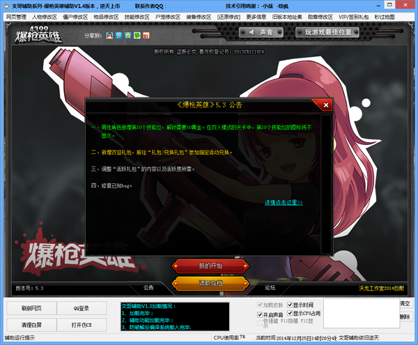文哥辅助系列最新“爆枪英雄辅助”逆天上市了,提供了E键秒杀、人物一键满级等众多逆天修改功能,还能修改勋章、免费领取礼包和秒过地图,文哥辅助可能存在更新,请点击“查看更新”下载更新,大概一周更新一次,点击"使用辅助“继续使用当前版本,谢谢使用!【软件功能】