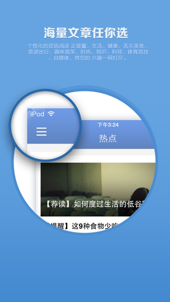 一、个性化的资讯阅读正能量、生活、健康、舌尖美食、旅游出行、趣味搞笑、时尚、知识、科技、体育竞技、自媒体,将您的兴趣一网打尽;