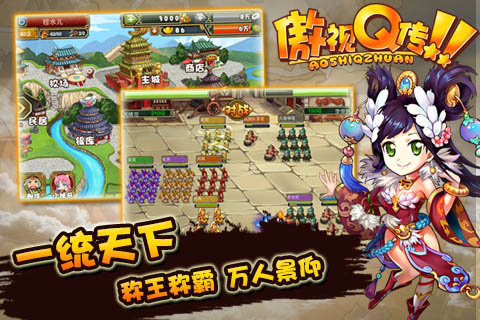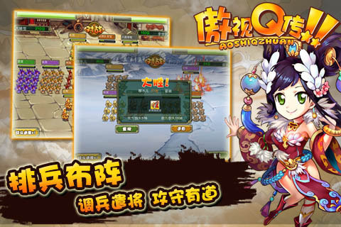 傲视Q传,你就是完美主公!三国题材养成策略大作!完美的武将养成体系,独特的竞技组合设定,丰富的战役故事情节,以军团、养成、交互为核心,通过发掘培养武将、升级装备、通关副本、与他人竞技,让玩家得到收集武将的乐趣、体验丰富关卡的乐趣和玩家间激战的乐趣。想要追寻三国时代血与火征程的就快加入吧!【游戏玩法】