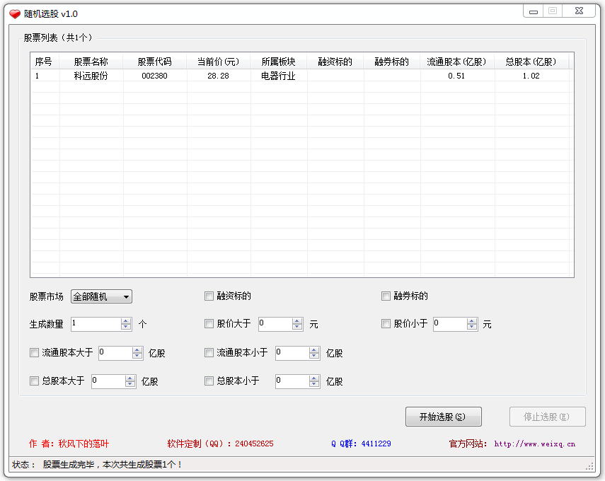 1、首先设定好股票的过滤条件,如股票市场、股价范围、流通股本、总股东和融资融券标的等2、点击【开始选股】按钮,软件将自动根据设定的条件选取股票,并将结果实时显示在列表上