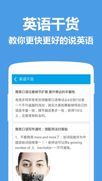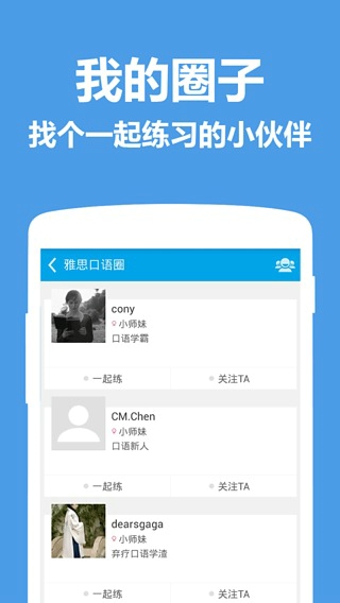 2014年360蒲公英创业扶持计划优质应用你还在对着电脑或者手机如复读机式的练习? 你out了,来口语圈找个靠谱的学习伙伴一起练习口语吧!口语圈是一款通过英语社交圈子来寻找英语学习伙伴,一起练习,一起提高的英语口语学习应用。 口语圈为用户提供了丰富标准的口语对话模板,让大家在和学习伙伴练习的过程中,边模仿边提高。口语圈还自带离线单词,只要轻轻触摸不认识的单词,即方便快捷的获得该单词的中文释义,大家快来体验吧!