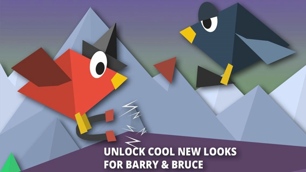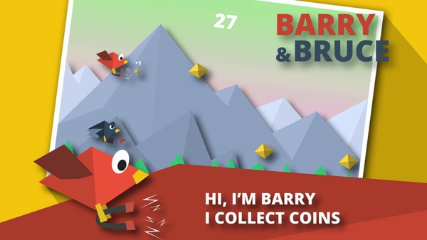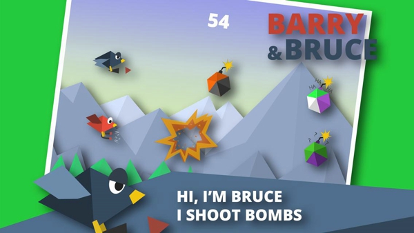 《巴里和布鲁斯( Barry & Bruce )》游戏中玩家需要控制红蓝两只小鸟获得宝石并避开炸弹,红色的鸟巴里负责吸取宝石,而蓝色的鸟布鲁斯则负责清除空中的炸弹。游戏操作十分特别,通过按住及放开屏幕来控制画面中两只不同技能的小鸟进行游戏,虽然操作简单,但十分考验玩家的手速和反应力。