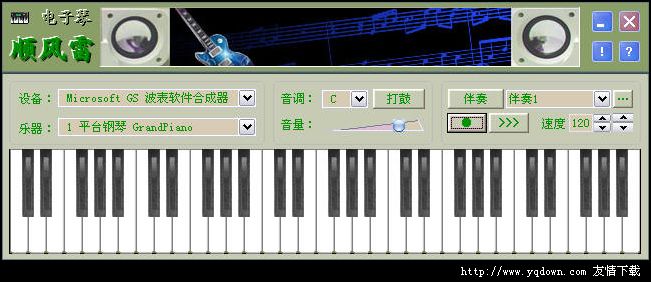 顺风雷电子琴是一款用电脑声卡来模拟电子琴弹奏软件。本软件调用系统128种乐器,和46伴音鼓。可用鼠标或键盘弹奏、自定义伴奏、录音、放音、小键盘可快速转换伴奏。适合青少年学习音律、或业余娱乐。
